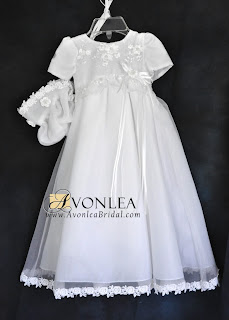 | “SHILOH” $43.95 Satin bodice with short sleeves. Organza skirt all over embroidered organza sleeveless jacket with petite bows on the top sides. Matching pearl and sequined embellished lace along all edges of the dress. Matching bonnet. Size 0 dress is approximately 15" long an the jacket is approximately 19" long in the back |